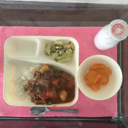 今日の献立は、ハヤシライス、キャベツのひじきドレッシング、みかん(缶)でした。