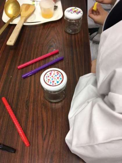瓶のふたに、一人一人がオリジナルの模様を描きます。最後にふたをして、逆さにむけてジャムの熱で消毒をします。