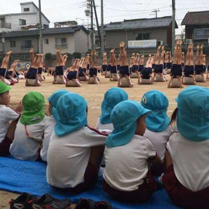 運動会もまじかになった9月27日 姫島幼稚園の年長組の森組・空組さんのお友達が、6年生の運動会の演技の練習を見に来てもらいました。