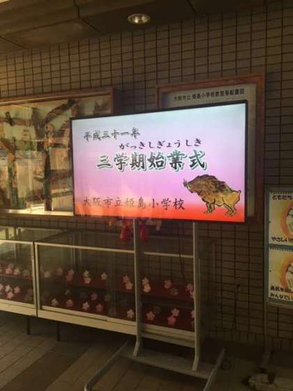 冬休みを終えて、子どもたちは元気に登校しました。その玄関では、デジタルサイネージ(液晶ディスプレイ)を使って、お正月のイメージ映像を流しました。