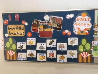 食育掲示コーナーでは、おせち料理の紹介を子どもたちが興味をもつように工夫して表示しています。