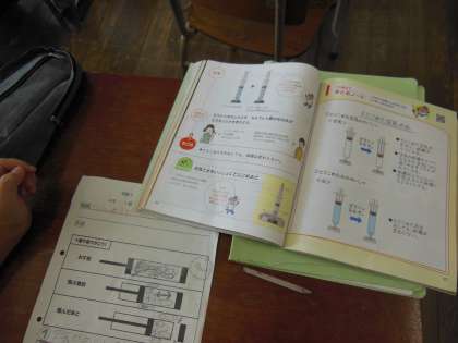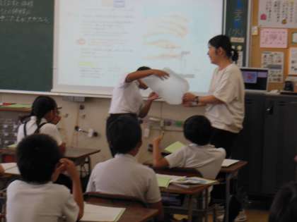 4年生の理科の授業です。「空気をとじこめると」の学習で、ビニル袋に閉じ込めた空気を触った感じの硬さを確かめていました。