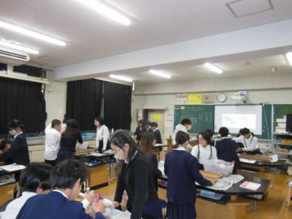 5年生の理科の授業の様子です。「流れる水の働き」の単元で、砂で川を作って水を流し、川の流れや土砂がどう変化していくかを観察していました。