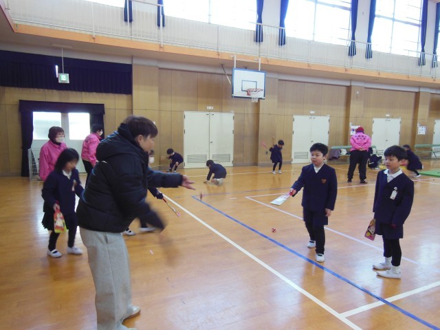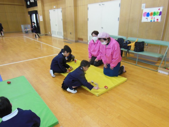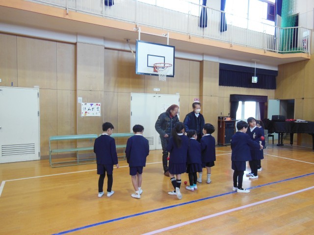 今日は1年生が昔あそび体験をしました。地域の方々をゲストティーチャーとして学校に来ていただいて教えていただきました。めんこ、おはじき、お手玉、けん玉、あやとり、だるまおとし、はねつき、コマ回しのコーナーに分かれてグループで活動しました。