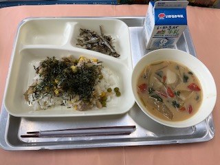 食糧をめぐる状況は給食が始まった頃とずいぶん異なりますが、こうして安心して給食をいただけることにあらためて感謝の気持ちを持ちたいです。子どもたちには、今日は給食委員会が給食週間のことを伝えてくれました。 -