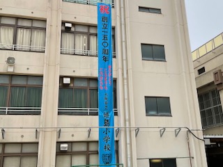 創立150周年記念式典まであと1ヶ月をきり、いよいよ間近です。このタイミングに合わせ、大きな垂れ幕を校舎の運動場側に設置しました。「青空高くそびえ立つ 白き学舎(校歌)」に目を引くブルーの垂れ幕。お祝いの気持ち、誇らしい気持ちがさらに盛り上がっていけばいいなと思います。