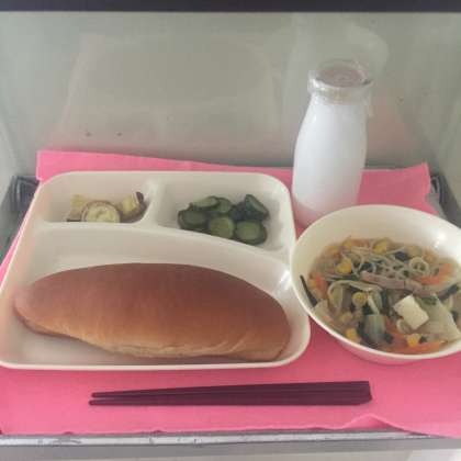 今日は、黒糖パン、みそラーメン、きゅうりの辛みづけ、焼きさつまいもの甘みつかけでした。