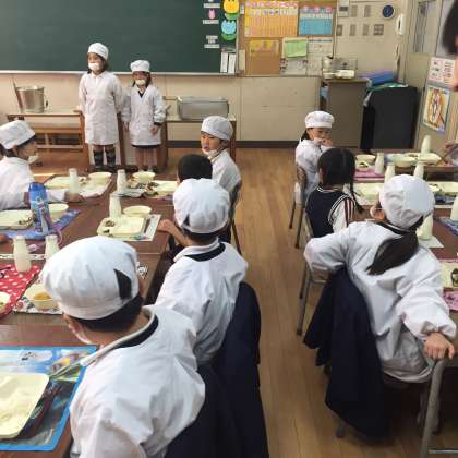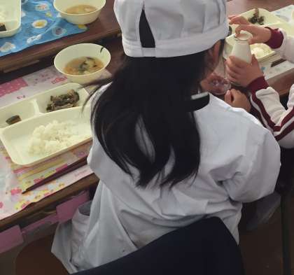 給食を食べに来られました。1年生2年生の教室に分かれみんなで楽しく会食しました。いつもは高学年の皆さんに世話をしてもらっている1・2年生。今日は、自分たちが先輩!(^^)! 頼もしく感じた1・2年生でした。