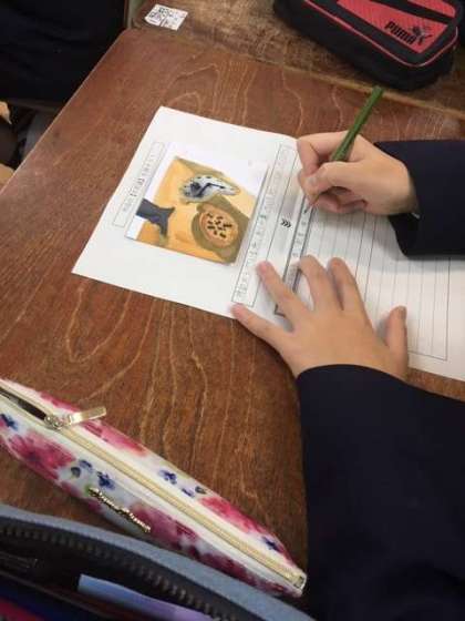 はじめにクラス全員で対話による鑑賞を行いました。その後ワークシートに自分なりの鑑賞をし、班ごとに話し合い、学級全体へと広めました。