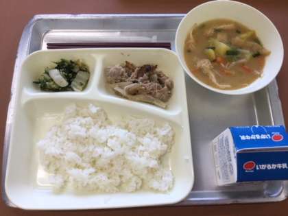 今日の給食は ■豚肉のしょうが焼き ■さつまいものみそ汁 ■きくなとはくさいのごまあえ ■ごはん ■牛乳 でした。