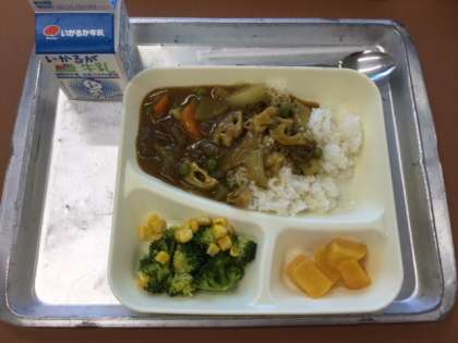 今日の給食は ■冬野菜のカレーライス ■ブロッコリーとコーンのサラダ ■黄桃 ■牛乳 の献立でした。