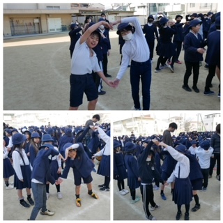 集会の中で、仲間と力を合わせてお題のポーズをとるコミュニケーションゲームがありました。ハート・星。みんな仲良く力を合わせて学校生活をすごそう。それがいじめをなくすことにつながるはずというメッセージが低学年の子どもたちにもよくイメージできたと思います。 -