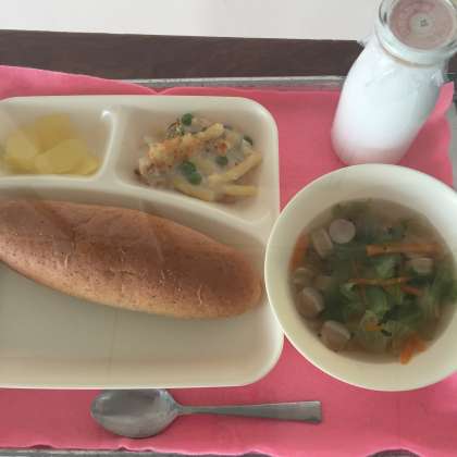 今日は、ライ麦パン、マカロニグラタン、レタスのスープ、りんごの缶詰でした。