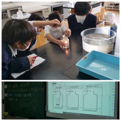 ゆっくりと校内を見てまわることができなかったのですが、今日のひとコマの紹介です。上の写真は6年生の理科の実験です。燃えるというはたらきについての学習で、酸素の中ではとてもよく燃えることを確認しています。実験で実際に目にすると、学んだ内容がぐっと深まります。