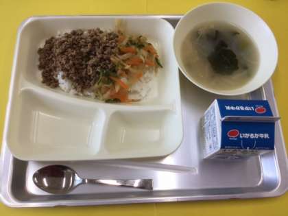 4月さいごの給食は ビビンバ トック 牛乳 の献立でした。昨日は洋風、今日は韓国朝鮮風の献立です。給食委員会の放送によると‥