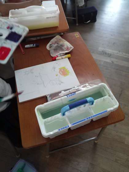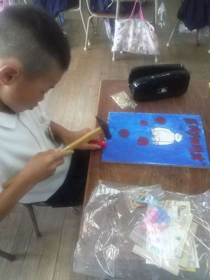 「くぎ打ちトントン」自分だけのオリジナルなゲームを作っています。今日は、まず土台となる板に色塗り