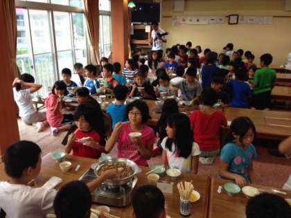 夕食は、「すきやき」です。ちょっと暑そうですが… そんなことは関係ありません。子どもたちは、ここでも元気いっぱい! おかわり自由のご飯に、群がっているそうです。