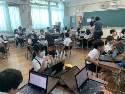5年生の授業の様子です。SDGSについての調べ学習で、「地球温暖化」や「平和と公平」などのテーマを決め、自分で調べたことをプレゼンにして発表していました。