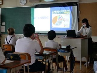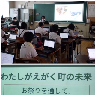 プレゼンテーションをしますとのお誘いをうけ、6年生の教室に参観に行きました。国語科および総合的な学習の時間に取り組んでいる「町の幸福論」。 自分たちがくらす社会の問題を取り上げ、どのような行動で改善につなげていくことができるのか、自分の考えを発表する学習です。学習者用端末を調査とまとめに使い視覚的に訴えるように工夫してまとめました。1つのクラスでは発表をききながら学習者用端末に発表者へのコメントを書き入れています。そんなことまでできるようになっているんだなと驚きました。
