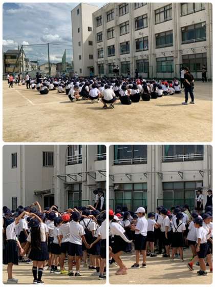 1年生の体育です。運動会に向けて、ラジオ体操の練習をしています。練習を重ねて、とても上手にできるようになってきました。