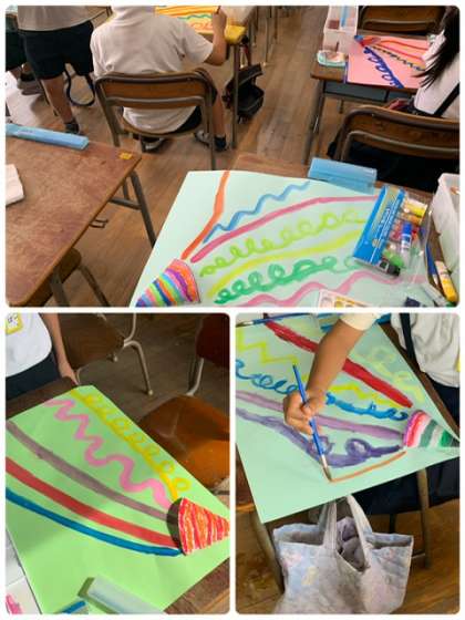 2年生の図工の様子です。「とびだすクラッカー」というテーマで、絵の具を使った筆の動かし方の練習をしています。クラッカーのところが立体的で、見ていて楽しい作品になっていました。