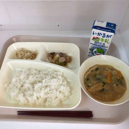 今日の献立は、ごはん、牛乳、焼きとり、みそ汁、もやしのゆずの香あえでした。