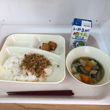 今日の献立は、ご飯、牛乳、鶏肉とじゃがいもの煮物、厚揚げのしょうゆだれかけ、紅ざけそぼろでした。