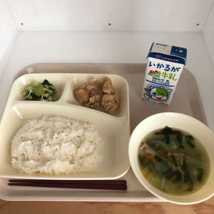今日の献立は、ご飯、牛乳、鶏肉のから揚げ、中華スープ、チンゲンサイともやしの甘酢あえでした。