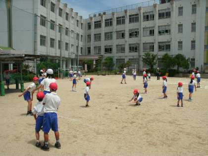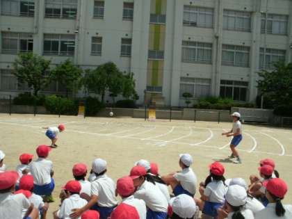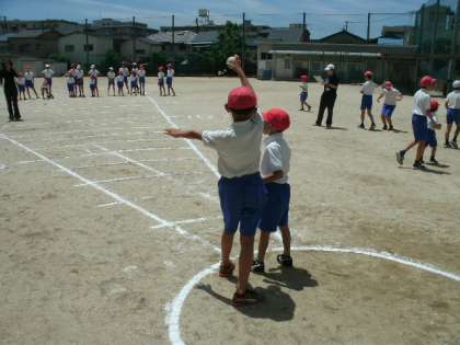 とてもいい天気の中、全学年ソフトボール投げの計測を行いました。写真は1年生と6年生です。1年生は小学校生活初めての経験です。6年生のお兄さん、お姉さんにやり方、ソフトボールの投げ方を教わり、投球しました。教えてもらったおかげで、フォームがきれいになりましたね。