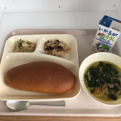 今日の献立は、黒糖パン、牛乳、金時豆の中華おこわ、中華スープ、ツナと野菜のオイスターソースいためでした。