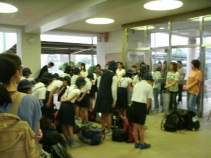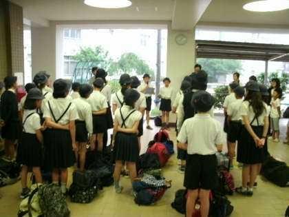 待ちに待った修学旅行の出発式です。校長先生のお話、代表児童の言葉、お見送りに来ていただいたお家の方への挨拶、諸連絡があり、出発です。雨が降っていますが、これから止んでいったらいいですね。学ぶところは学んで、楽しむところはしっかり楽しんでください。朝早くからたくさんのお家の方のお見送り、ありがとうございました。