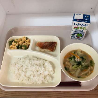 今日の献立は、ご飯、牛乳、赤魚のしょうゆだれかけ、みそ汁、えんどうの卵とじでした。