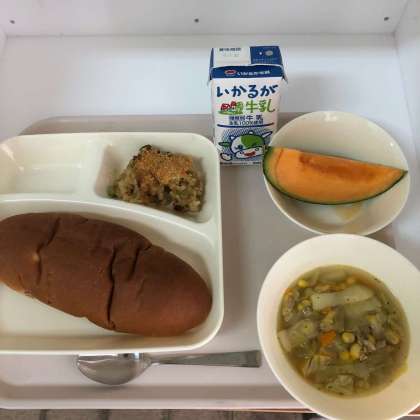 今日の献立は、おさつパン、牛乳、カレードリア、スープ、クインシーメロンでした。