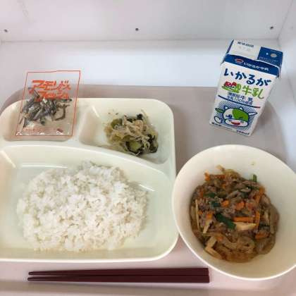 今日の献立は、ご飯、牛乳、マーボーはるさめ、チンゲンサイともやしの甘酢あえ、アーモンドフィッシュでした。