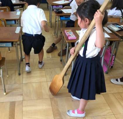 動画などで給食室にある機械や調理の様子を学習した後、給食調理員さんと同じように大きなしゃもじで混ぜる作業を体験しています。