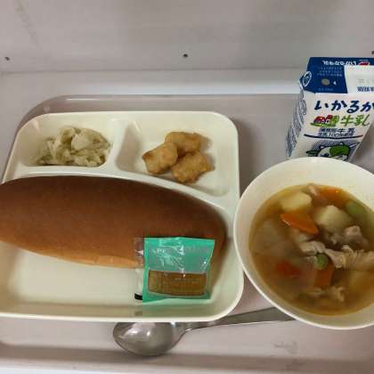 今日の献立は、コッペパン、牛乳、いか天ぷら、フレッシュトマトのスープ煮、サワーソテー、りんごジャムでした。