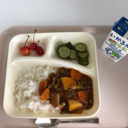 今日の献立は、牛乳、ハヤシライス、きゅうりのサラダ、さくらんぼでした。