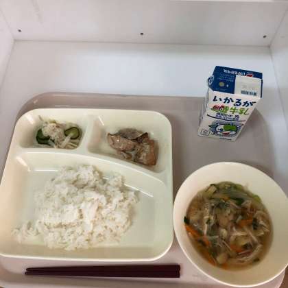 今日の献立は、ご飯、牛乳、鶏肉のしょうゆマヨネーズ焼き、五目汁、切り干し大根のゆずの香あえでした。
