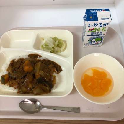 今日の献立は、牛乳、夏野菜のカレーライス、キャベツのサラダ、みかんの缶詰でした。