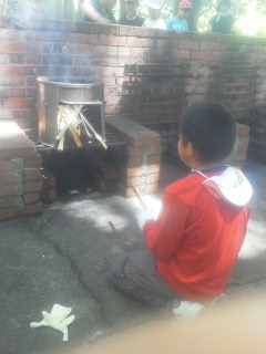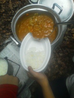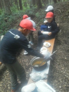飯ごう炊さんです。カレー作り。おいしそうにできました。みんな元気に食べています。