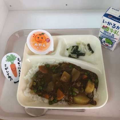 今日の献立は、牛乳、ビーフカレーライス、野菜のピクルス、みかんゼリーでした。