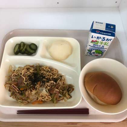 今日の献立は、黒糖パン、牛乳、焼きそば、きゅうりの甘酢づけ、梨でした。