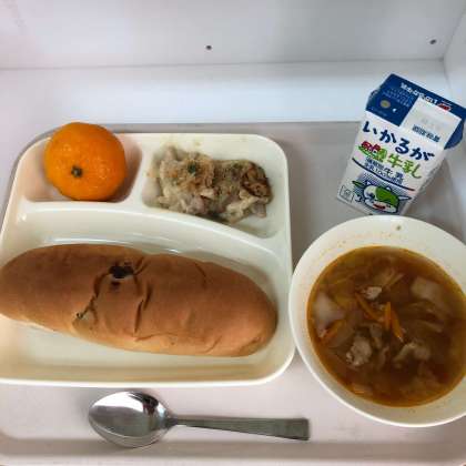 今日の献立は、レーズンパン、牛乳、豆乳マカロニグラタン、トマトスープ、冷凍みかんでした。