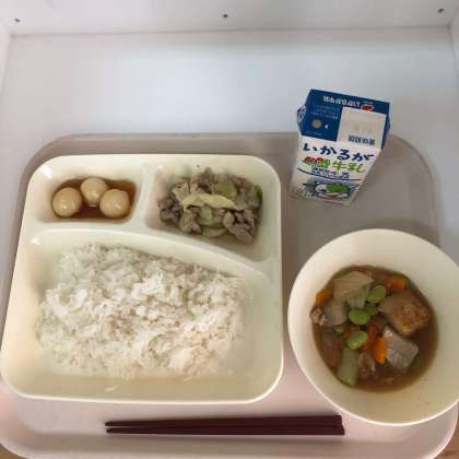 今日の献立はご飯、牛乳、鶏肉と里芋の煮物、豚肉とキャベツの炒め物、みたらしだんごでした。
