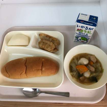 今日の献立は、おさつパン、牛乳、揚げギョーザ、中華煮、梨でした。