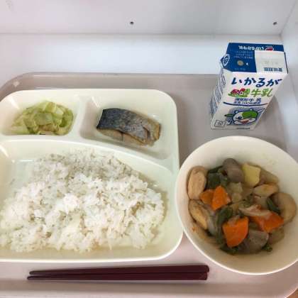 今日の献立は、ご飯、牛乳、さごしの塩焼き、じゃがいもと一口がんもの煮物、キャベツのおひたしでした。