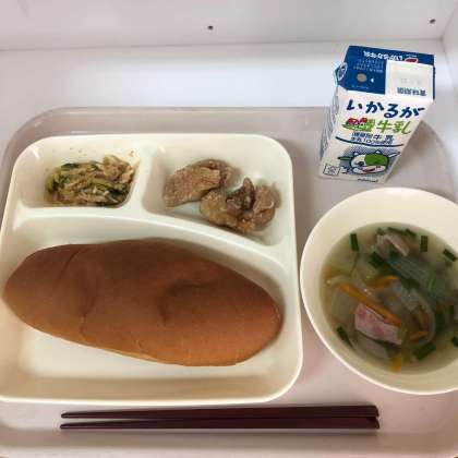 今日の献立は、黒糖パン、牛乳、鶏肉のから揚げ、冬瓜の中華スープ、切干し大根のごま辛みづけでした。