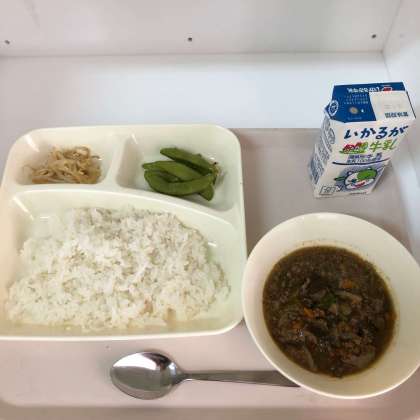 今日の献立は、ご飯、牛乳、マーボーなす、もやしのごま酢あえ、枝豆でした。