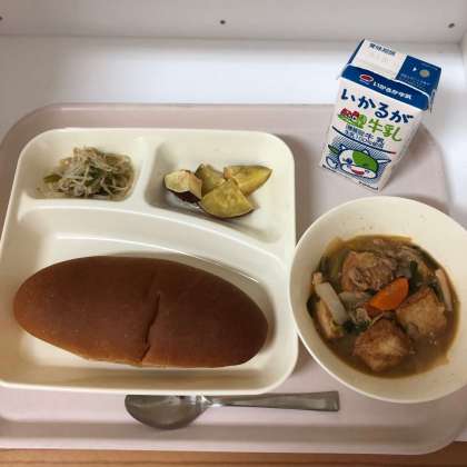 今日の献立は、黒糖パン、牛乳、豚肉といかの中華煮、焼きさつまいもの甘みつかけ、もやしとピーマンの炒めものでした。