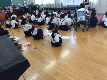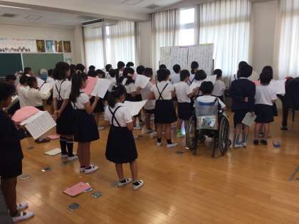 授業の様子です。音楽の時間に5年生が3年生を指導しながら授業を行っています。たてわり班で他の学年も行っています。5年生の歌声に3年生が引っ張られる感じがしました。普段見ることのできない良いところを見ることもできました。さすが、お兄さん、お姉さんです。